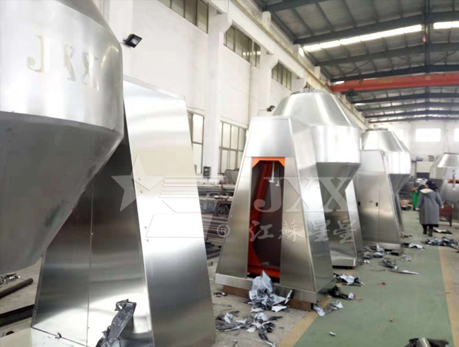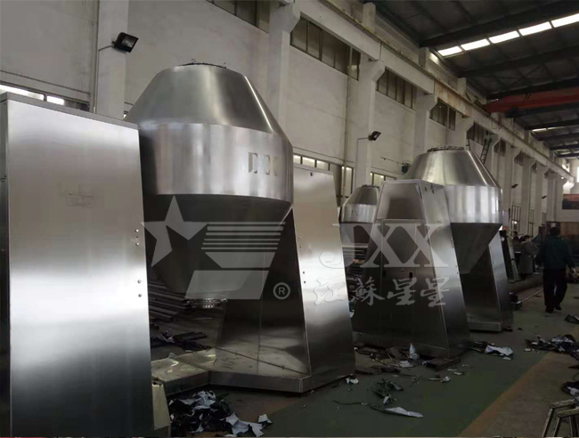 双锥回转真空干燥机为双锥形的回转罐体,罐内在真空状态下,向夹套内通入蒸汽或热水进行加热,热量通过罐体内壁与湿物料接触,湿物料吸热后蒸发的水汽,通过真空泵经真空排气管被抽走。由于罐体内处于真空状态,且罐体的回转使物料不断的上下内外翻动,故加快了物料的干燥速度,提高干燥效率,达到均匀干燥的目的。