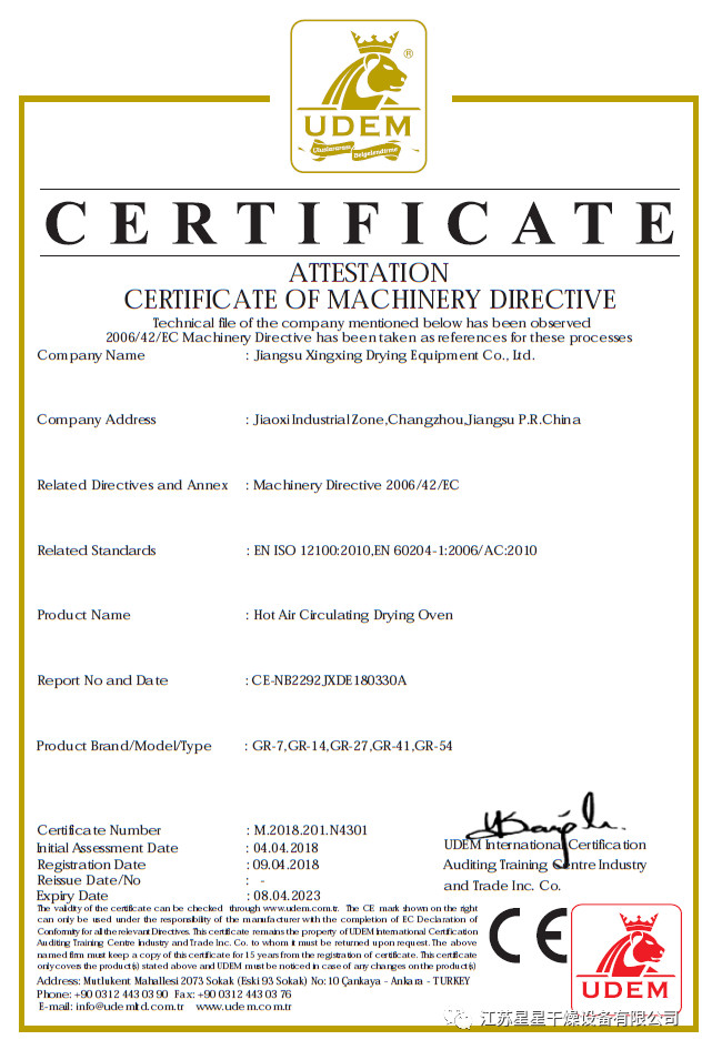 “CE”标志是一种欧盟安全认证标志,被视为制造商打开并进入欧盟市场的护照。为了顺应欧盟市场需求,扩大出口,江苏星星干燥设备有限公司在全体员工的努力下,公司主打产品“热风循环烘箱”系类产品顺利取得欧盟CE认证证书,成为行业内取得“热风循环烘箱”欧盟CE认证证书的企业。认证工作前后共进行了仅仅5天的时间,更创造了取得该CE认证证书短时间的记录,另一方面也体现了我公司生产的“热风循环烘箱”已经高标准达到了欧盟指令规定的要求,在质量性能、稳定性能和安全性能方面都符合欧盟国家的出口质量标准。获得此项荣誉,是江苏星星干燥设备有限公司对客户的一种承诺,更增强了客户对我公司产品的信任度。