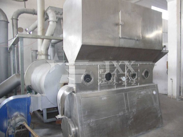 洁净的热风经阀板分配进入床体内,从加料器进入的湿物料被热风形成沸腾状态。由于热风与物料广泛接触,增强了传热传质的过程,因此在较短时间内就可干燥。如用连续型,物料从床体的一头进入,经过几十秒至几分钟沸腾干燥,自动从床体另一头流出。本设备一般进行负压操作。