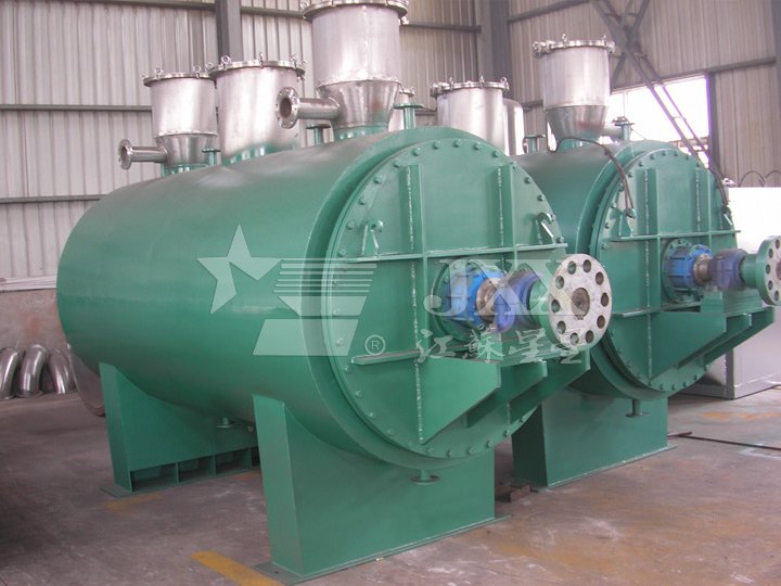 本机是一种新颖卧式间歇式真空干燥设备,湿物料经传导蒸发,带有刮板搅拌器不断清除热面上的物料,并在容器内推移形成循环流,水份蒸发后由真空泵抽出。